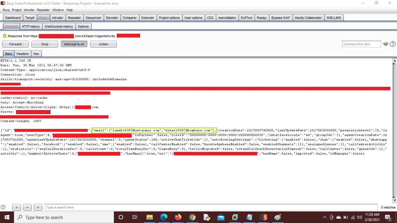 - Then I sent an invitation again (laneko6393@astarmax.com) and captured the request and manipulated it with an array appending new email (winaxi9052@bombaya.com) and I received invitations on both the emails
