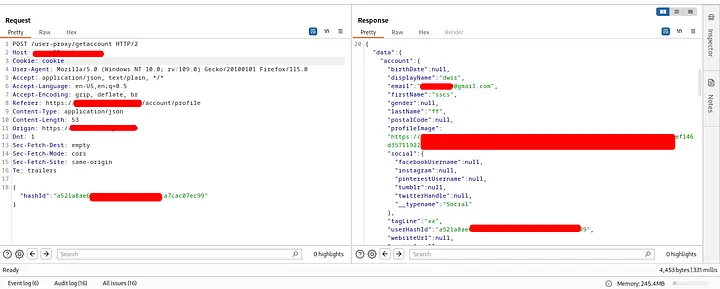 Then I noticed that any request made in the profile section has a hashId post parameter that identify the user. Any request like get/update/delete any user information uses this parameter: