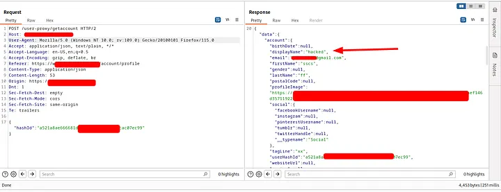 So I was thinking about an IDOR in this parameter so I get another user hashId and replace it in the original request and send it, But It didn’t work(It’s not that easy).