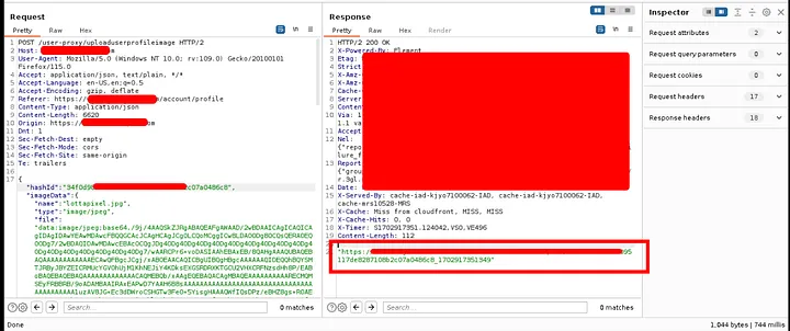 I used burpsuite search to search for the hashId in httphistory and I found that when I uploaded my profile image, It’s uploaded to another website and the url was like:
