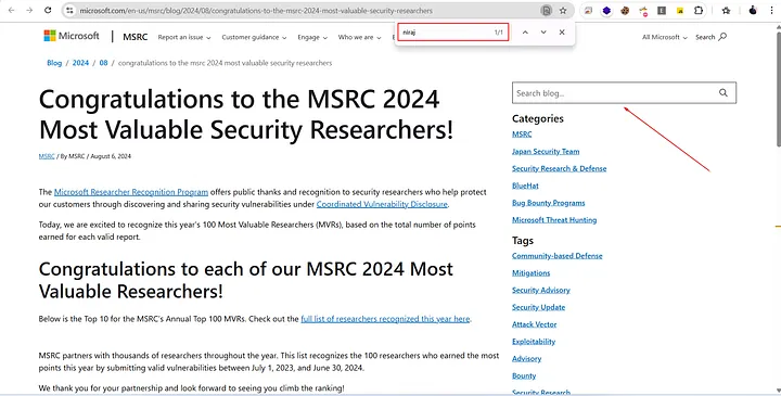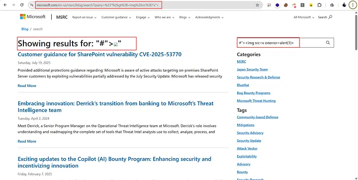 On this Microsoft blog page, there’s a search bar that allows users to look up blogs. Out of curiosity, I searched for my name again 😄 — and noticed that it was being reflected directly on the page.