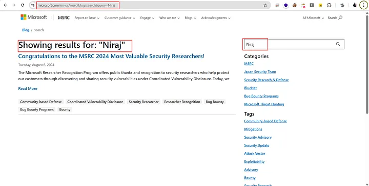 While searching my name on Google using keywords like “Niraj MSRC,” I came across a Microsoft blog post (https://www.microsoft.com/en-us/msrc/blog/2024/08/congratulations-to-the-msrc-2024-most-valuable-security-researchers) where I was listed in 3rd position among the MSRC 2024 Most Valuable Security Researchers — recognized as one of the top Dynamics 365 researchers!