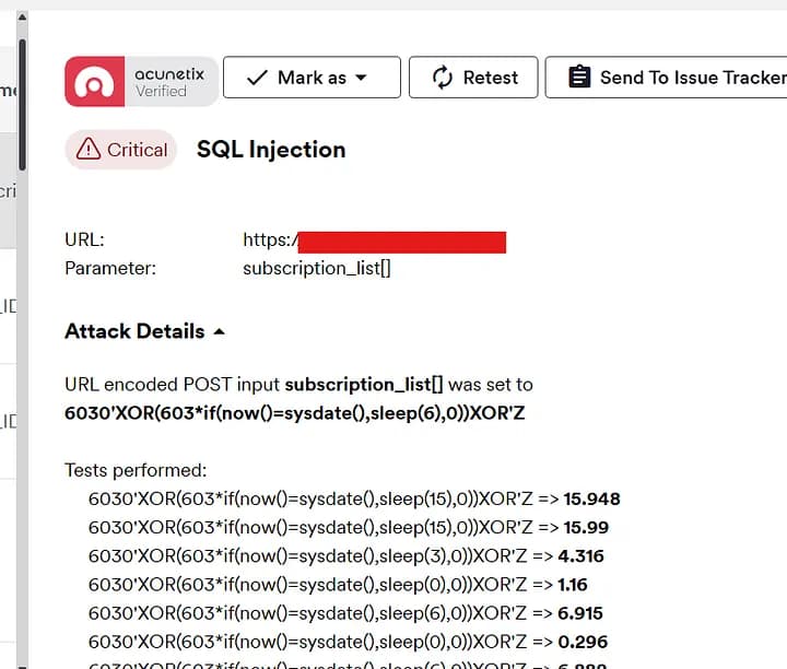 Within 5 minutes, Acunetix flagged SQL Injection with a red alert 🚩.The scanner detected a time-based SQLi using XOR payloads.