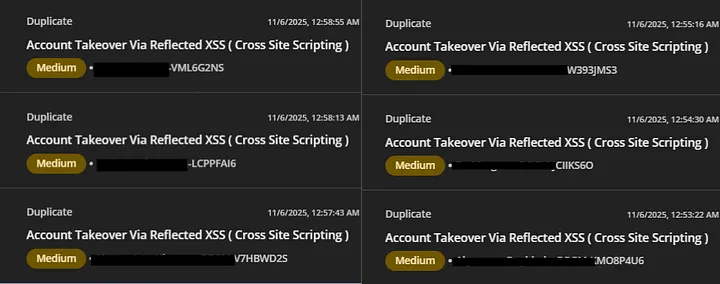 I submitted six individual reports, each containing a clear PoC and impact assessment. The twist? The vendor came back saying the findings were duplicates , the root cause was a researcher reported the same vulnerability in all of the programs. That sounds like a frustration for researchers at first, but for me it’s not, i have learned a lot of things since those were my first 6 valid reports in my journey.