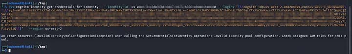 I got an error output saying that The error InvalidIdentityPoolConfigurationException with the message “Invalid identity pool configuration. Check assigned IAM roles for this pool” during get-credentials-for-identity indicates a configuration issue on the Cognito Identity Pool side. This is a server-side problem, as a user without admin access, cannot directly fix.