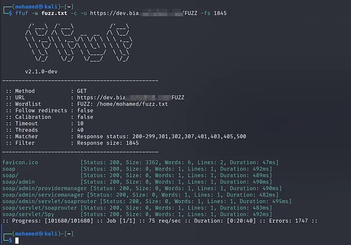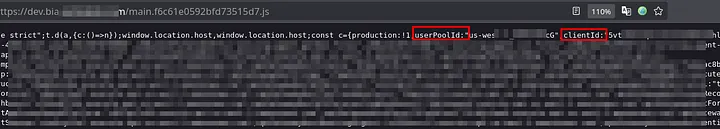 I opened this JS file https://dev.bia.example.com/main.f6c61e0592bfd73515d7.js and start to look at interesting words like: api, secret, password, aws, apikey, user, admin ..etc