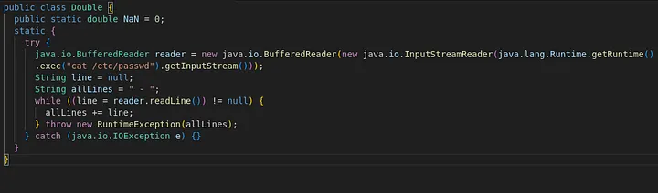 bash double result = Double.NaN; When accessing the static attribute NaN of our manipulated Double class, it initiates the execution of the static block of code. The manipulated Double class, utilized as a Proof-of-Concept, is outlined below: