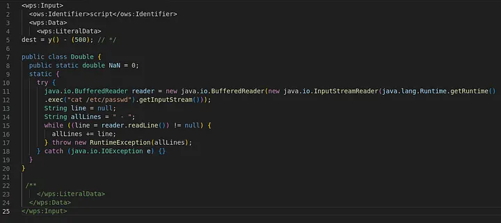 Executing a command becomes straightforward. We utilized the following Double class to initiate the execution of the "cat /etc/passwd" command: