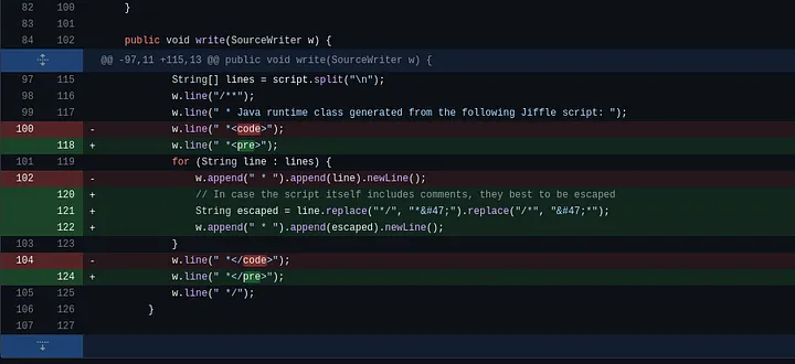 By looking at the patch [JAI-EXT-PATCH], one can quickly identify that Javadoc comment escaping has been added to the it.geosolutions.jaiext.jiffle.parser.node.Script write method. As we've seen above, this method is used by Jiffle to convert the scriptModel to Java source code.