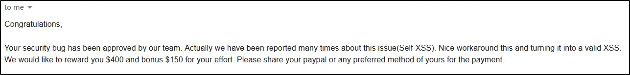 This was a great find for me as it impacted other users. Technically I don’t think its a stored XSS as it will execute only once after the user visits the link.