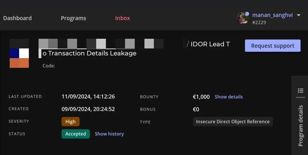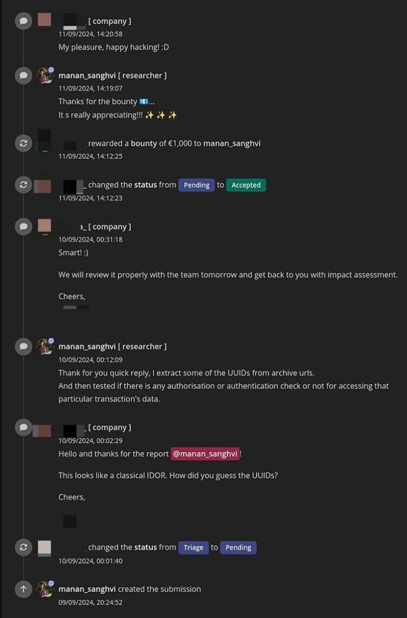 The triager was quite impressed with my method! 😏 They even discussed the issue with the company to understand its impact more thoroughly. While the payment ID was unguessable, which reduced the immediate risk, the exposure of sensitive transaction data was still a significant concern.
