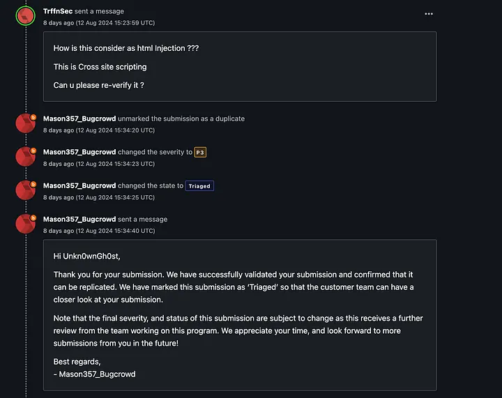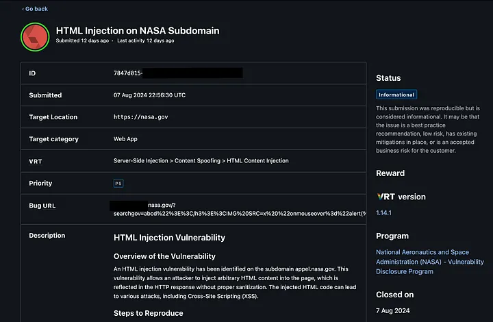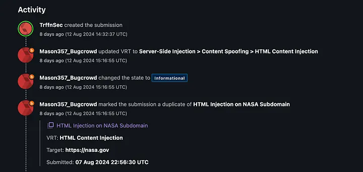 Feeling pumped, I reported the bug. But then, NASA hit me with a curveball they marked it as "informative" and a duplicate of my previous HTML injection report.