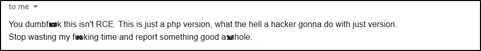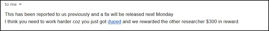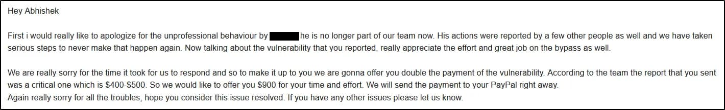 This was enough to prove RCE and so I quickly reported and hoping it was not duped this time. Since it was a bypass I just sent it to the same guy to which he replied.