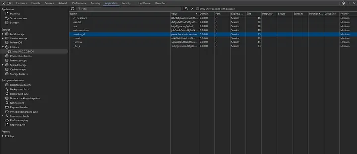 - The attacker opens the Developer Console (F12), goes to the Cookies section, clears their existing session cookies, and replaces it with the admin’s session ID. Then, they refresh the page.