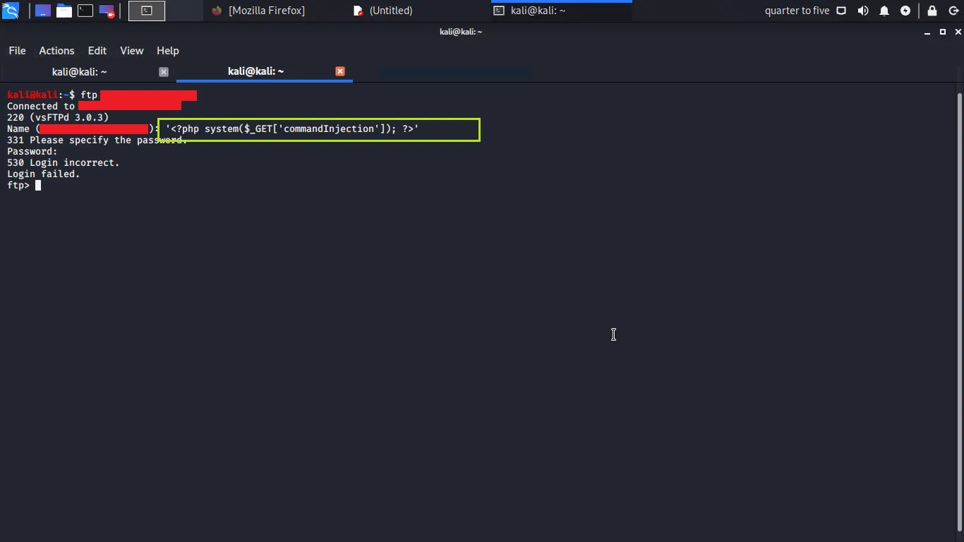 - I tried to make fake attempts with a PHP payload as a user on the ftp server of my target which will be saved in the vsftpd.log file