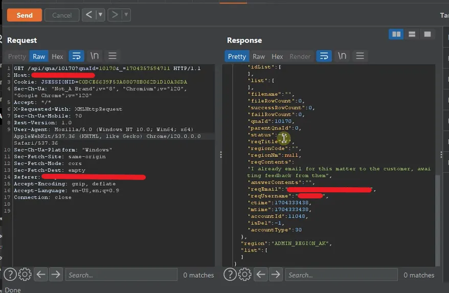 This ID is also easily guessable, just like the previous vulnerability. So, I changed qnaId=10171 to qnaId=10170, and just like that, I got access to another user’s sensitive data and their communication with the company.