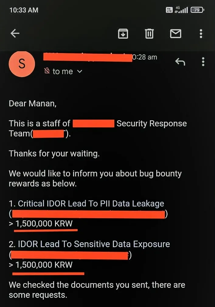These vulnerabilities, known as Insecure Direct Object References (IDOR), allowed unauthorized access to sensitive user information with relative ease. By highlighting these flaws, I not only helped to safeguard the privacy and security of over 50,000 users but also underscored the importance of thorough security testing and remediation efforts in safeguarding digital assets against potential threats. and yes, it also worth my Hardwork and got $2259 Bounty.