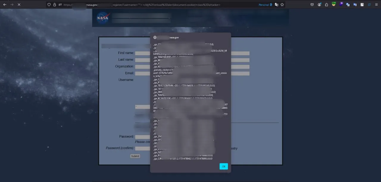 dalfox url https://xxx.nasa.gov/xxx_register/And boom! I found XSS on username parameter.