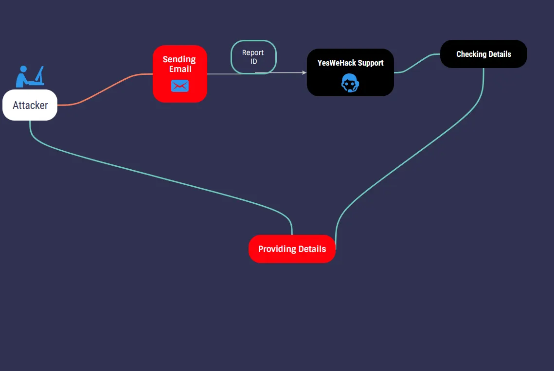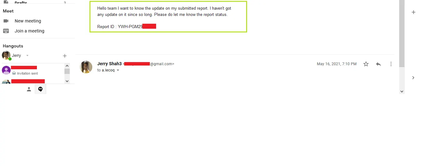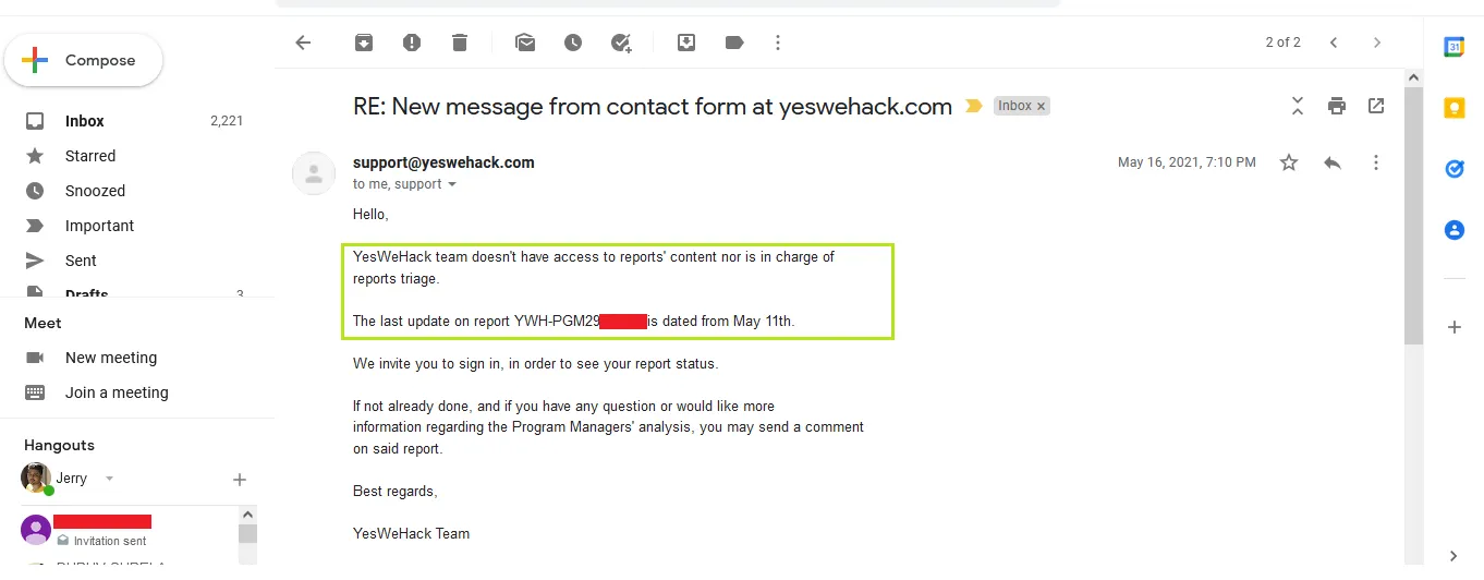 - I dropped a mail from my gmail account to YesWeHack support team asking them about the report update by providing report ID of another account