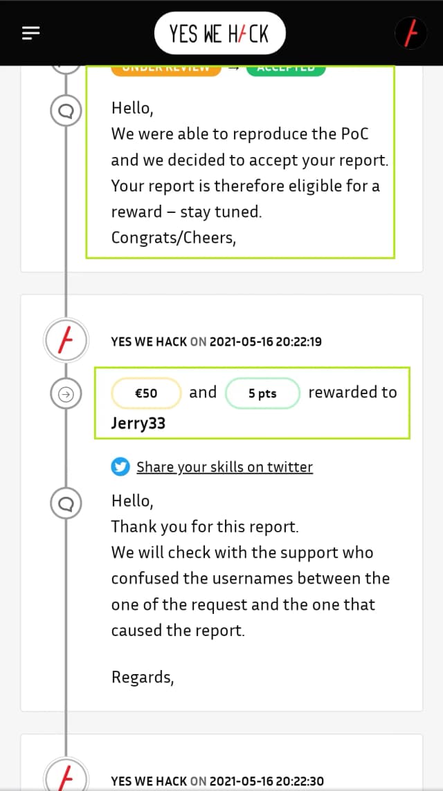 I simply asked the support team about the report status by providing them with the report ID of another account and they replied me about last updated date. However support team disclosed only this much information so it was accepted as a low risk issue by YesWeHack and they awarded me with a bounty of 50 euros.