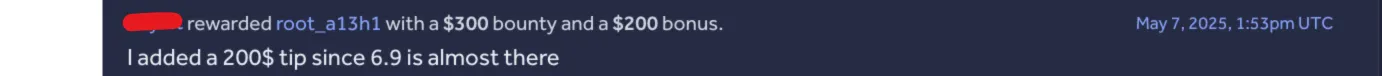 - May 7, 2025 - Rewarded $300 + $200 bonus.
